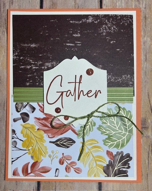 Gathering Moments created by Kim Innis for the 2025 Holiday Catalog and Sept Online Exclusives Swap Stamp Set: Gathering Moments, Ink: Pecan Pie, Card Stock: Timid Tiger, Very Vanilla, Accessories: To the Point Label Punch, Old Olive Linen Thread, Gathering Together DSP, Cajun Craze & Gold Dots, Dimensionals