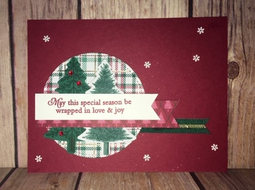 Perfectly Plaid created by Lisa Miller Card Stock: Cherry Cobbler, Shaded Spruce, Whisper White Ink: Cherry Cobbler, Shaded Spruce, Soft Sea Foam, Soft Suede Accessories: Snowflake Sequins, Red Rhinestones, Shaded Spruce/Gold Striped Ribbon, Tripple Banner Punch, Stitched Shape Dies, Champagne Shimmer Paint (Spritz over entire card)